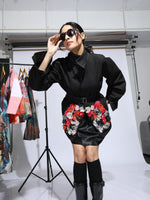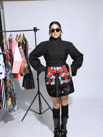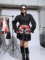 organza floral details on pockets.