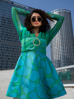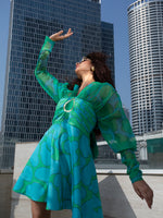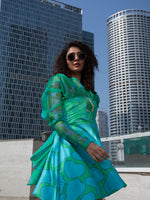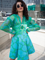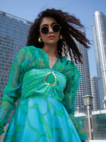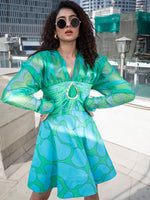 - Green shaded printed dress with organza dramatic sleeves on top.