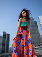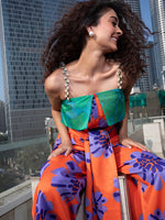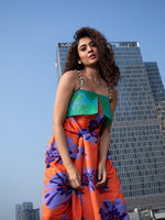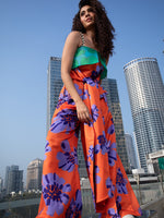- Orange floral top with green organza flap with a long elongated belt in front waist for a good fit.