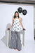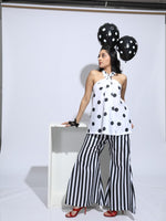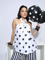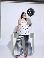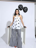 Halter top of polka dots print with black and white stripe pants.