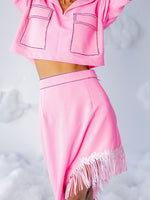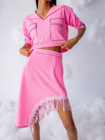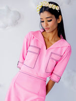 Comfortable top with black highlight on pockets and twisted slant skirt with bringing lace.