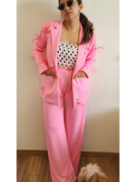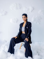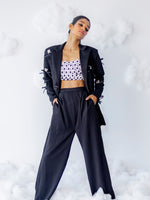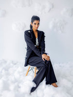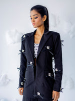Fitted bustier with floral lace, studded Jacket with bows and black trouser.