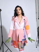 Blush pink jacket with Eiffel tower print on left, with clouds around in front.
