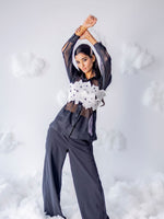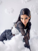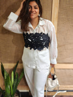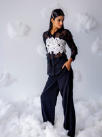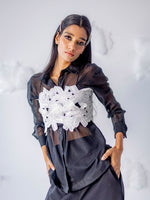 - Lace fitted bustier on black mesh shirt with black trousers.